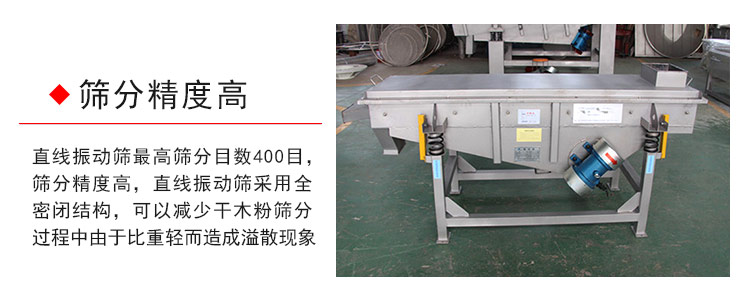 直線振動篩高篩分目數400目,篩分精度高,直線振動篩采用全密閉結構,可以減少干木粉篩分過程中由于比重輕而造成溢散現象。