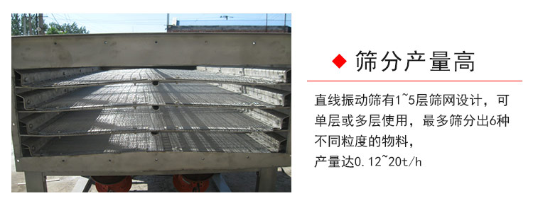 直線振動篩有1~5層篩網設計,可單層或多層使用,多篩分出6種不同粒度的物料,產量達0.12~20t/h。