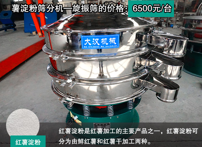 紅薯淀粉是紅薯加工的主要產品之一,紅薯淀粉可分為由鮮紅薯和紅薯干加工兩種。紅薯淀粉其還有減肥的作用,那么紅薯淀粉篩分機—旋振篩的價格是多少呢?小編為你提供做真實的答案薯淀粉篩分機—旋振篩的價格:6500元/臺